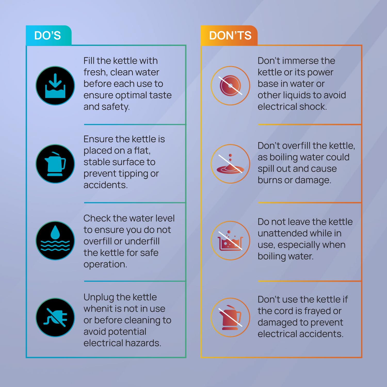 Cool Touch Kettle - The cool touch exterior ensures a worry free user experience, making it safe for everyone to use Triple Layer Protection - Protects against overheating, dry-boil, and excess steam, making it a safe and reliable appliance Anti-Rust Technology - Shields the kettle from rust buildup and ensures that it is hygienic and long-lasting Ultra Fast Boiling - Saves your valuable time by boiling water quickly with the 1200 W high-power 2 Year Warranty Provided by Wipro