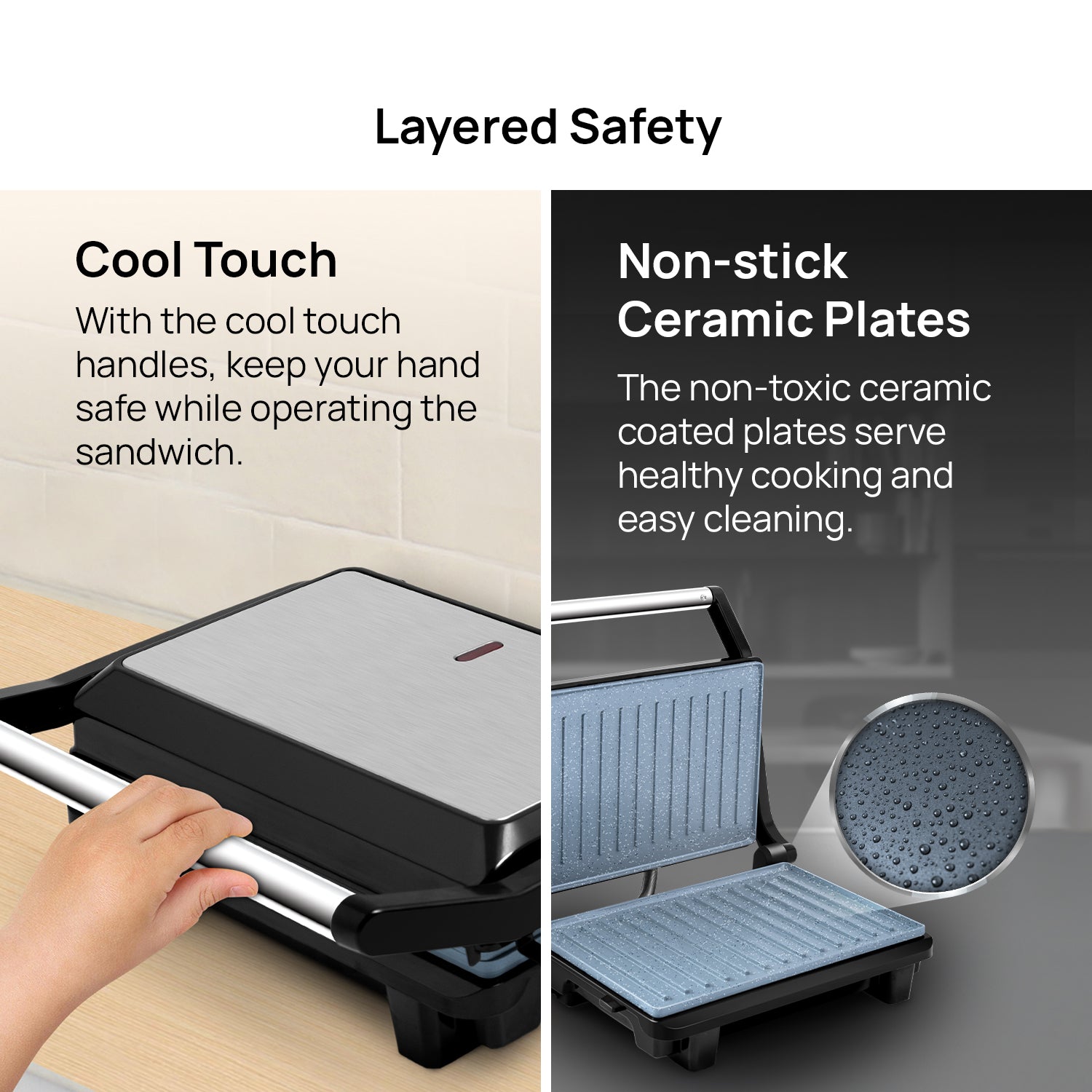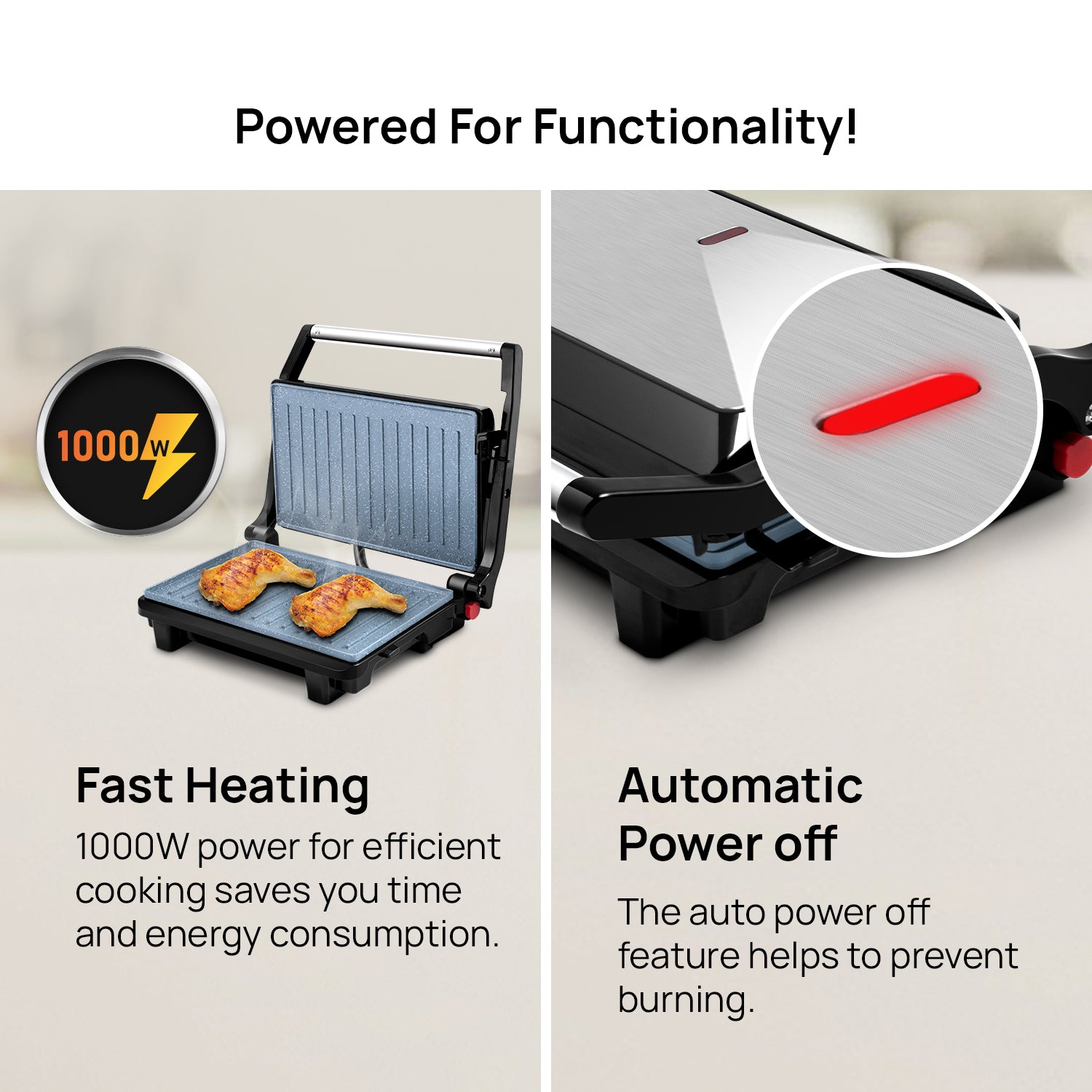 • Truly multifunctional Grill Sandwich Maker which could used to make a sandwich maker to panini ,toast & Roast and also operate as a smokeless indoor Grill • Sandwich Maker – Big size Non Toxic Ceramic plates (230mm*145 mm) opens upto 105ᶿ (Extra 15ᶿ) for easy operation and usage • Grill – With Huge plates can also be used to grill with plated opening upto 180ᶿ • Auto cut off feature to avoid excessive burning of food and stress free operation • Cool touch handle for safety and easy usage • Easy to clean non stick grill with quick heat up enabled by 1000 Watt function