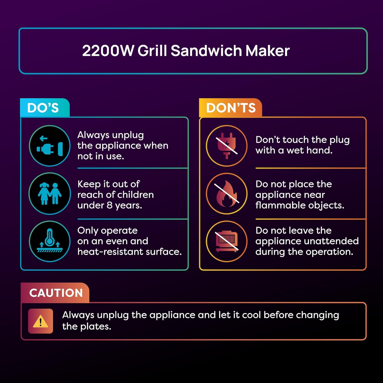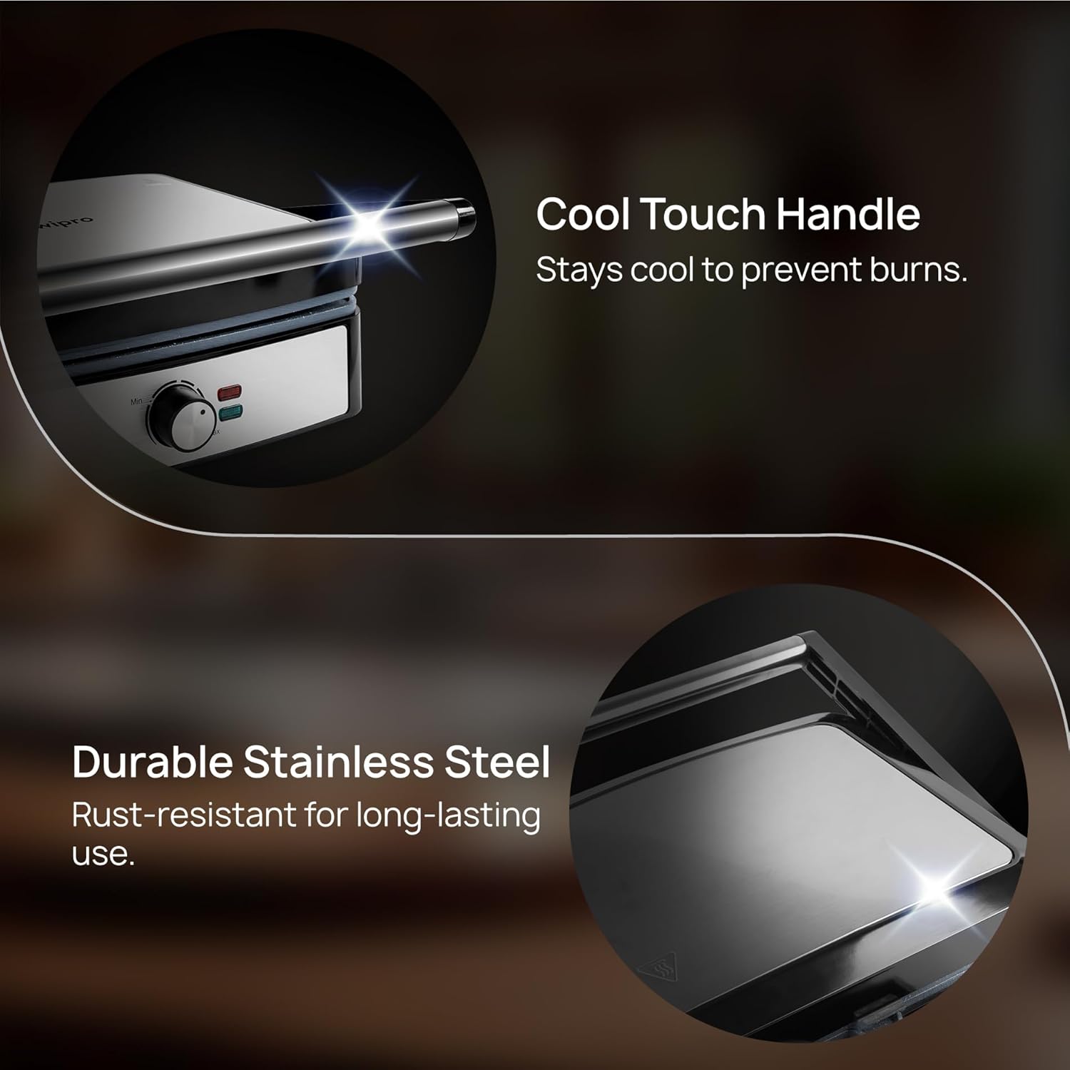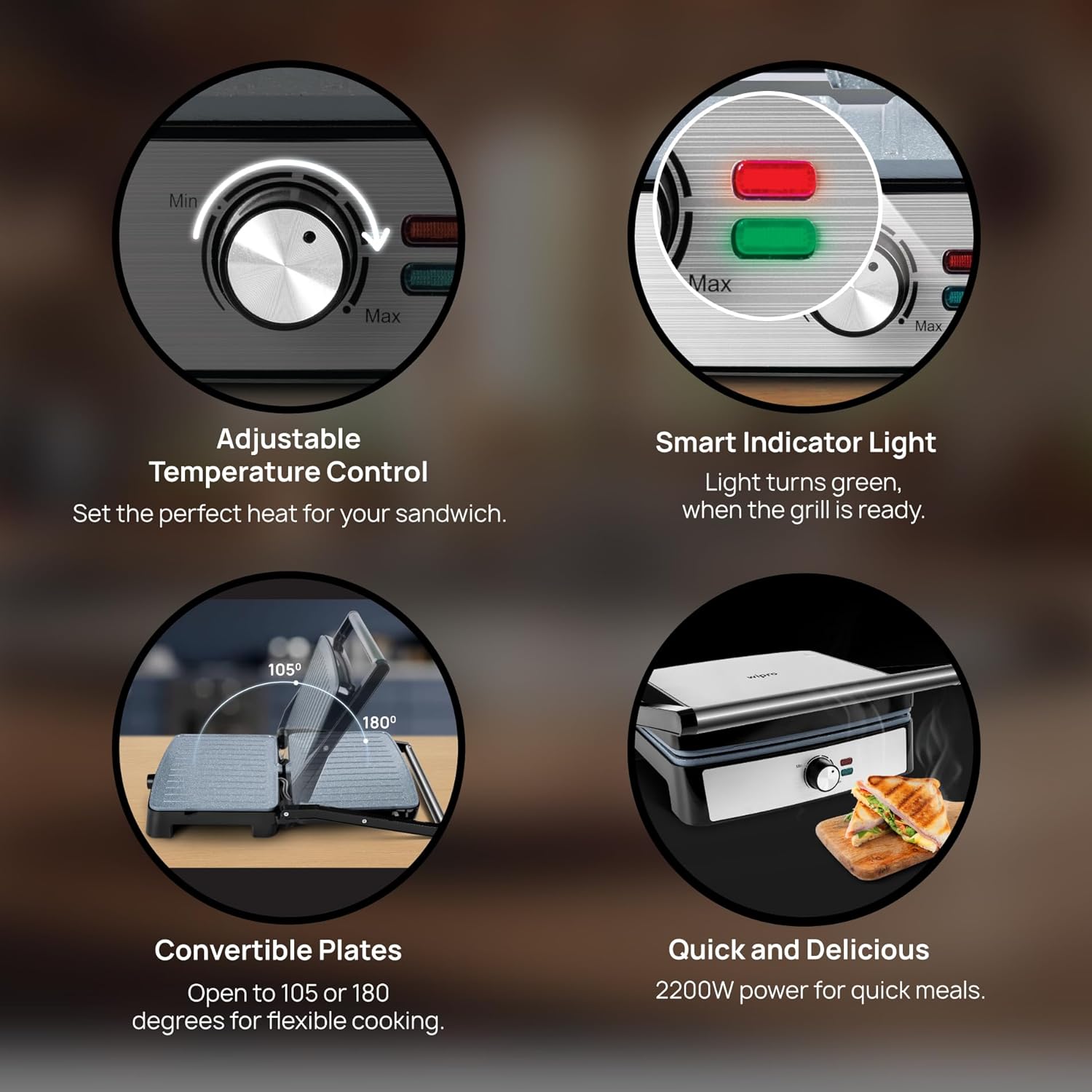 Multi Heating Modes, 180° Open Sandwich Griller, Non-Toxic BPA/PTFE/PFOA/PFAS Free, 2 Year Warranty, Regular Bread Size for 4 Slices. Grill – With Huge plates can also be used to grill with plated opening upto 180ᶿ