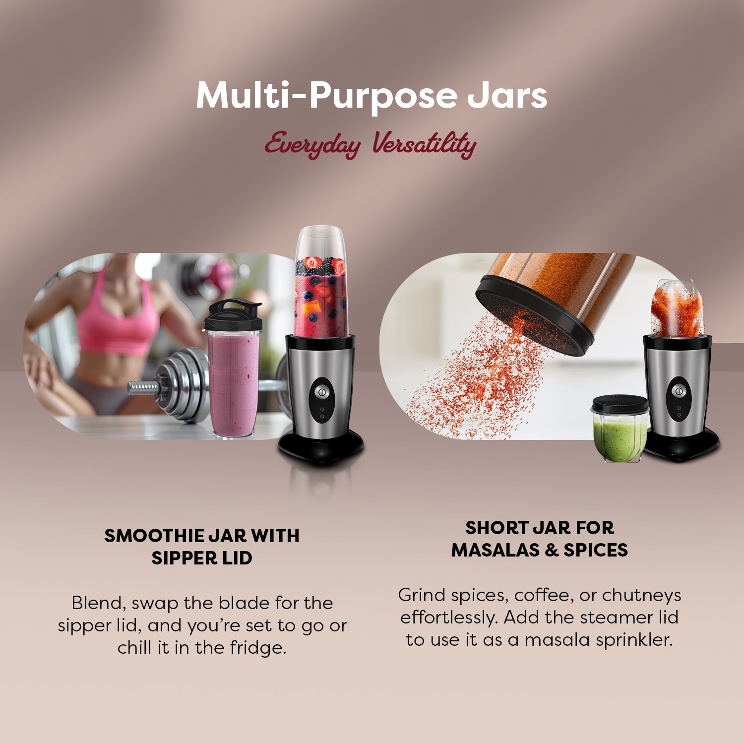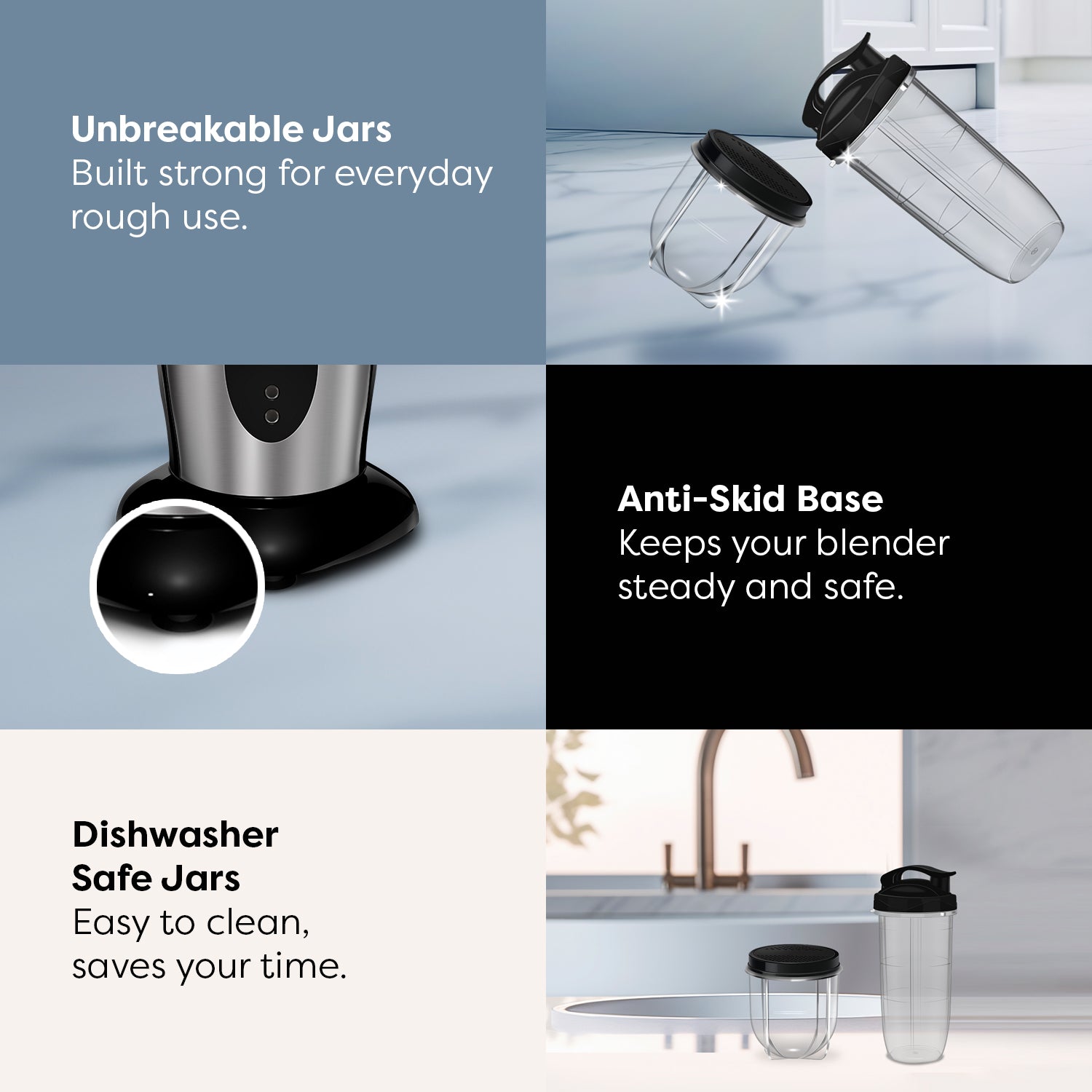 Colour: Silver With Black Special Feature: Compact, Intelligent Sensor Technology, Lightweight, Unbreakable Jars Product Dimensions: 23D x 13.5W x 26.5H Centimeters Included Components: 2 Unbreakable Jars, 300 ML Jar with storage Lid, 700 ML Jar with Slipper & Lid Style: Countertop Blenders Recommended Uses For Product: Blending, Grinding, Whipping Power Source: Corded Electric Number of Speeds: 1 Voltage: 230 Volts