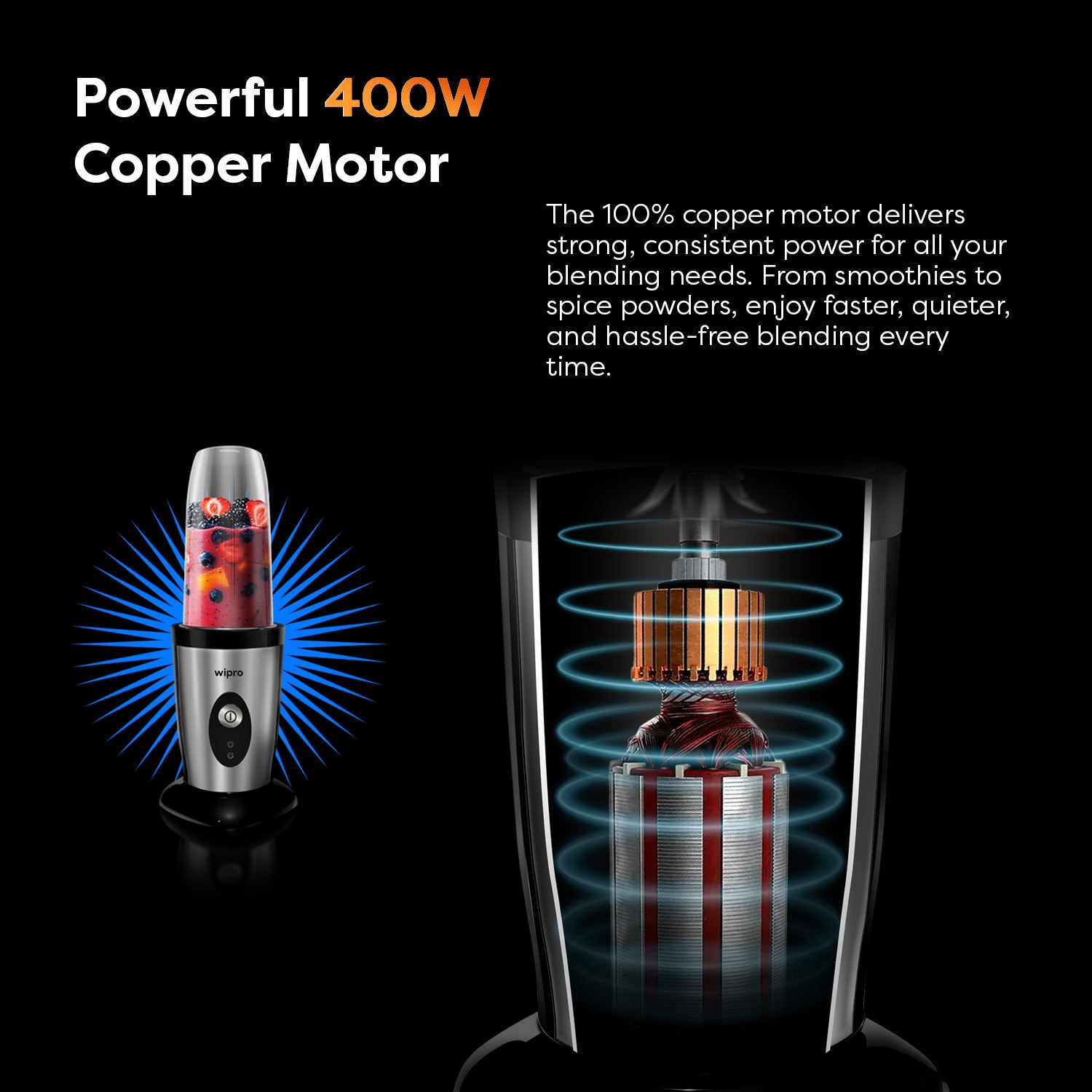 Colour: Silver With Black Special Feature: Compact, Intelligent Sensor Technology, Lightweight, Unbreakable Jars Product Dimensions: 23D x 13.5W x 26.5H Centimeters Included Components: 2 Unbreakable Jars, 300 ML Jar with storage Lid, 700 ML Jar with Slipper & Lid Style: Countertop Blenders Recommended Uses For Product: Blending, Grinding, Whipping Power Source: Corded Electric Number of Speeds: 1 Voltage: 230 Volts Controls Type: Push Button Material Type Free: BPA Free Warranty Type: 2 Year Limited Warranty Container Count: 2 Manufacturer : Wipro Enterprises Private Limited, Wipro Enterprises Private Limited, Email ID : info.appliances.ext@wipro.com; Contact Support : 1800-425-1969 & WhatsApp : +91 96064 47222 Manufacturer : Wipro Enterprises Private Limited Country of Origin: India Item model number: FCB 104