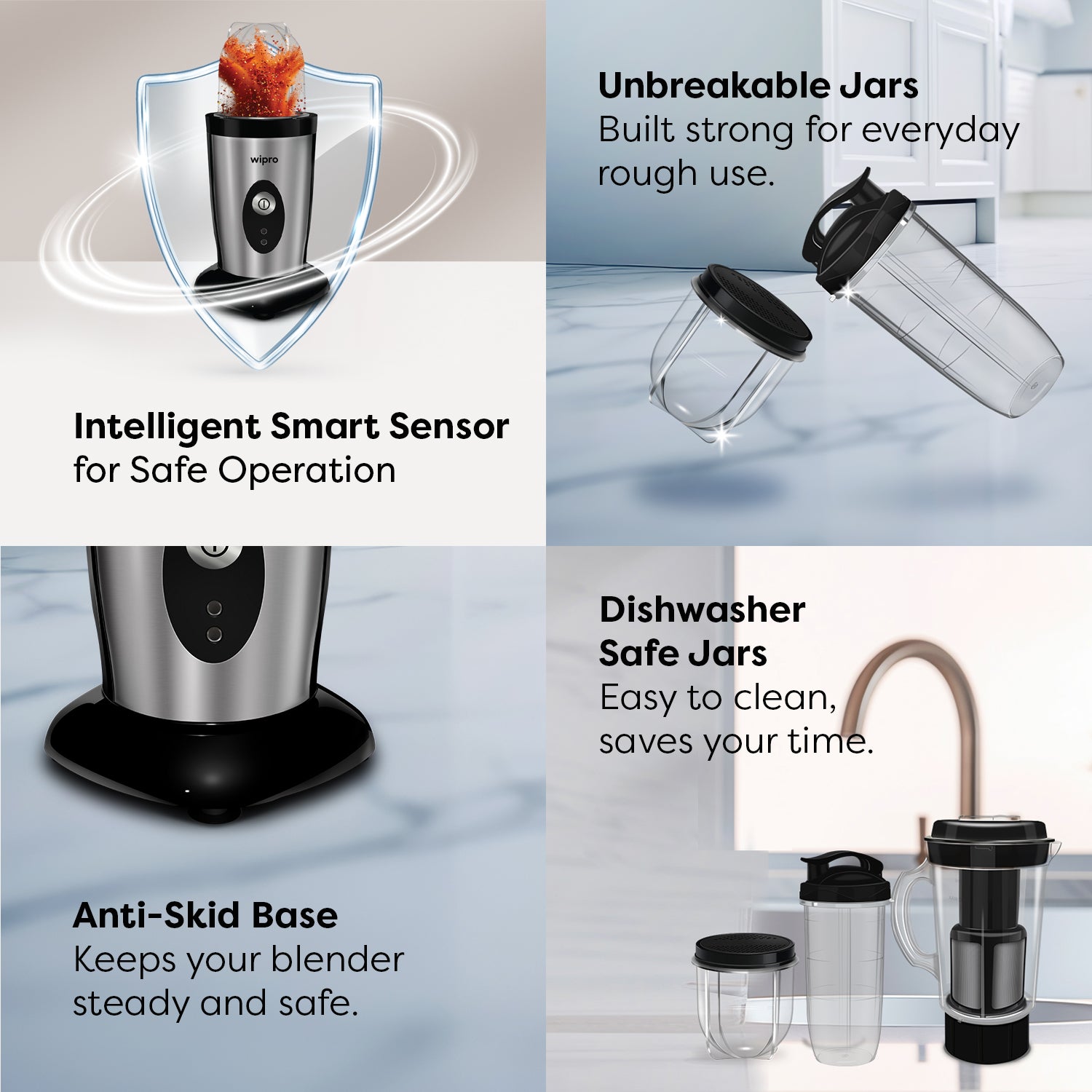 Colour: Silver With Black Special Feature: Compact, Intelligent Sensor Technology, Lightweight, Multiple Attachments, Unbreakable Jars Product Dimensions: 33D x 13.5W x 26H Centimeters Included Components: 1150 ML Juicer Jar, 3 Unbreakable Jars, 300 ML Jar with storage Lid, 700 ML Jar with Slipper & Lid Style: Countertop Blenders Recommended Uses For Product: Blending, Grinding, Whipping Power Source: Corded Electric Number of Speeds: 1 Voltage: 230 Volts Controls Type: Push Button Material Type Free: BPA Free Blade Material: Stainless Steel Warranty Type: 2 Year Limited Warranty Container Count: 3 Manufacturer : Wipro Enterprises Private Limited, Wipro Enterprises Private Limited, Email ID : info.appliances.ext@wipro.com; Contact Support : 1800-425-1969 & WhatsApp : +91 96064 47222 Country of Origin: India Item model number: FCB 105